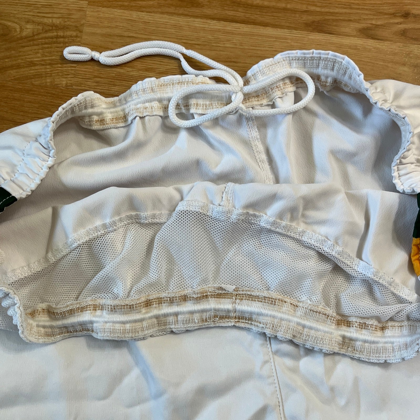 Shorts are in fair condition. Drawstring is still there. Budweiser patch on the right leg has came off. Number is in fair condition with little wear